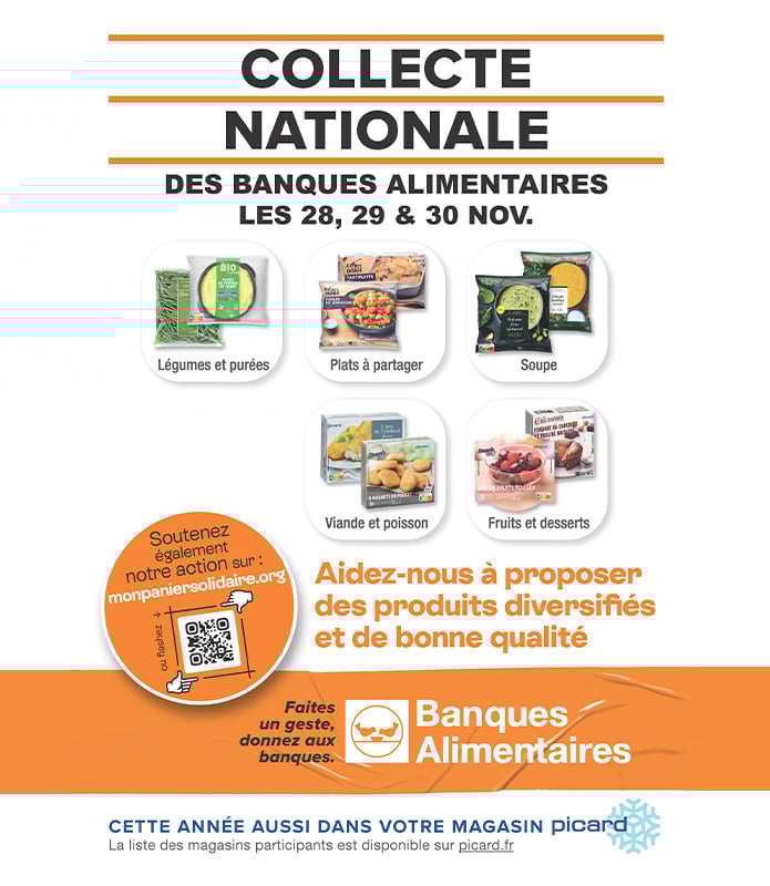 71 magasins Picard se mobiliseront durant la Collecte Nationale des Banques Alimentaires les 28,29 et 30 novembre pour collecter des produits alimentaires au profit des bénéficiaires des Banques Alimentaires. Légumes, poissons, viandes, desserts fruités… nos produits répondent à de nombreux besoins du quotidien pour accompagner les personnes en situation de précarité alimentaire.
